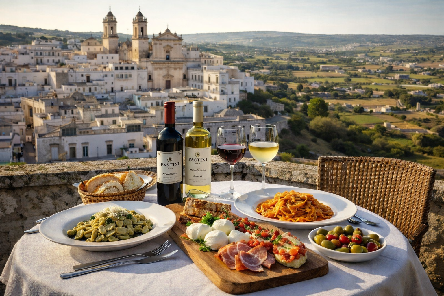 Order orecchiette with cime di rapa, handmade and dressed simply with olive oil pressed just outside town. Try capocollo di Martina Franca, the local cured meat the region is famous for, sliced thin and served with fresh bread and a glass of Primitivo or Negroamaro.